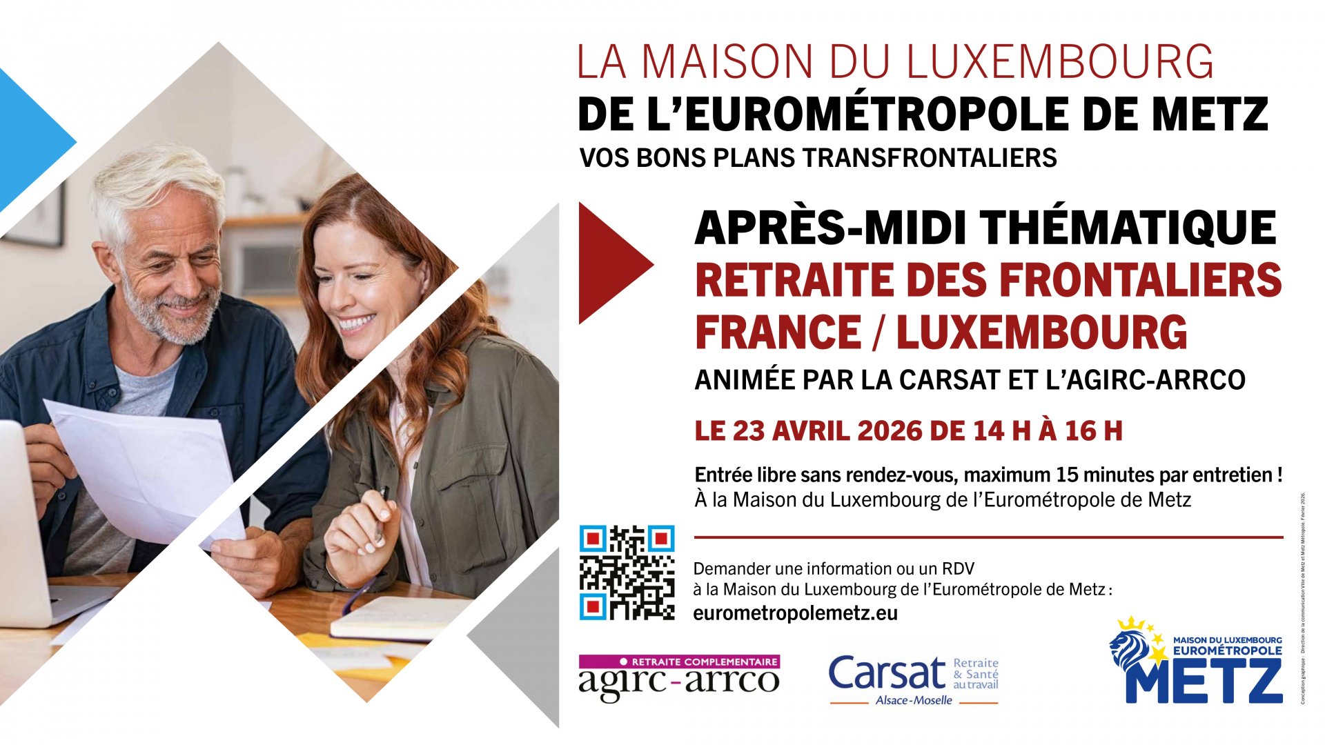 La Maison du Luxembourg de l'Eurométropole de Metz organise un après-midi thématique « Retraite des Frontaliers France-Luxembourg » à destination des travailleurs frontaliers en partenariat avec la CARSAT ALSACE MOSELLE et L'AGIRC-ARRCO le jeudi 23/04/2026 de 14h00 à 16h00.